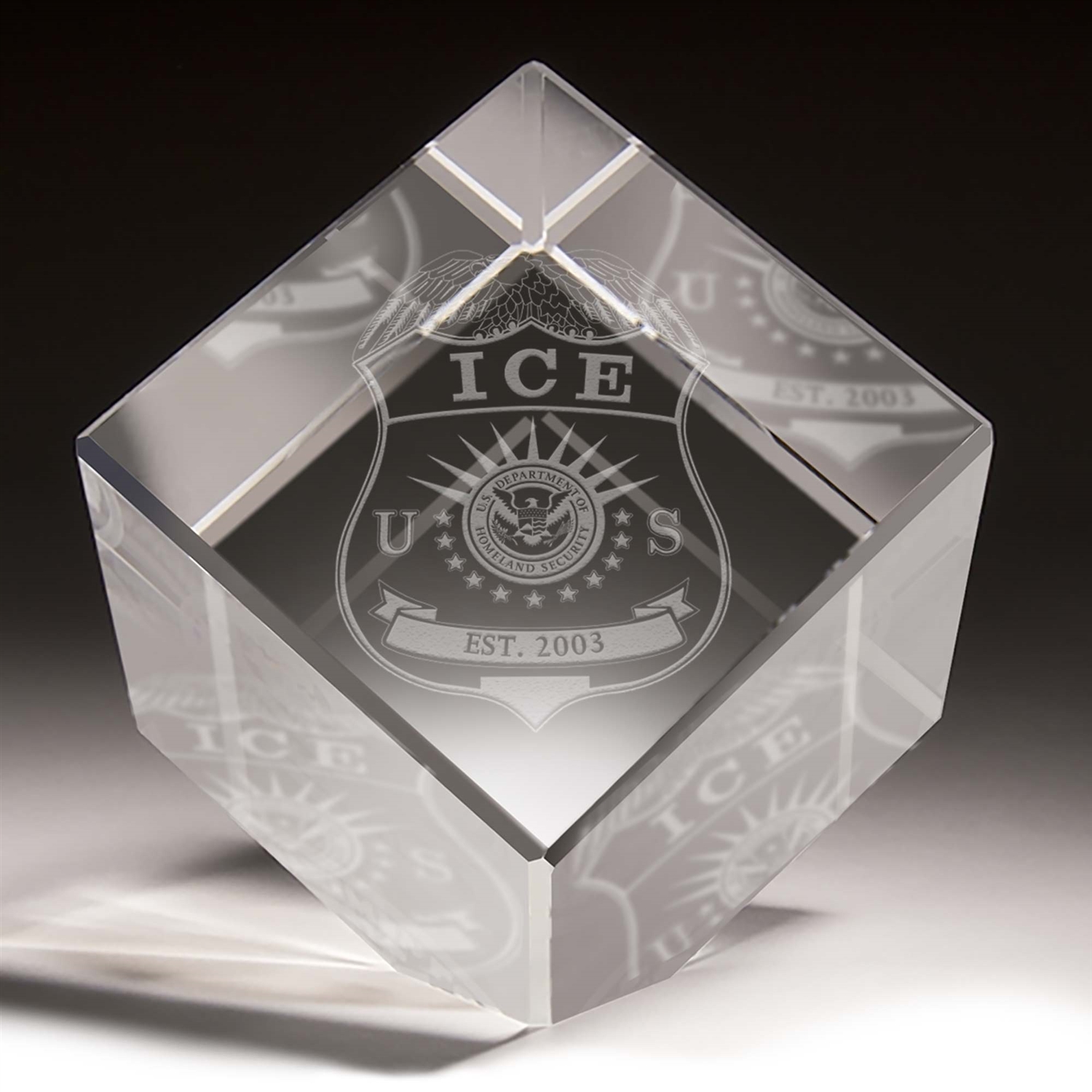 Crystal cube with laser etched 3-D ICE Badge.