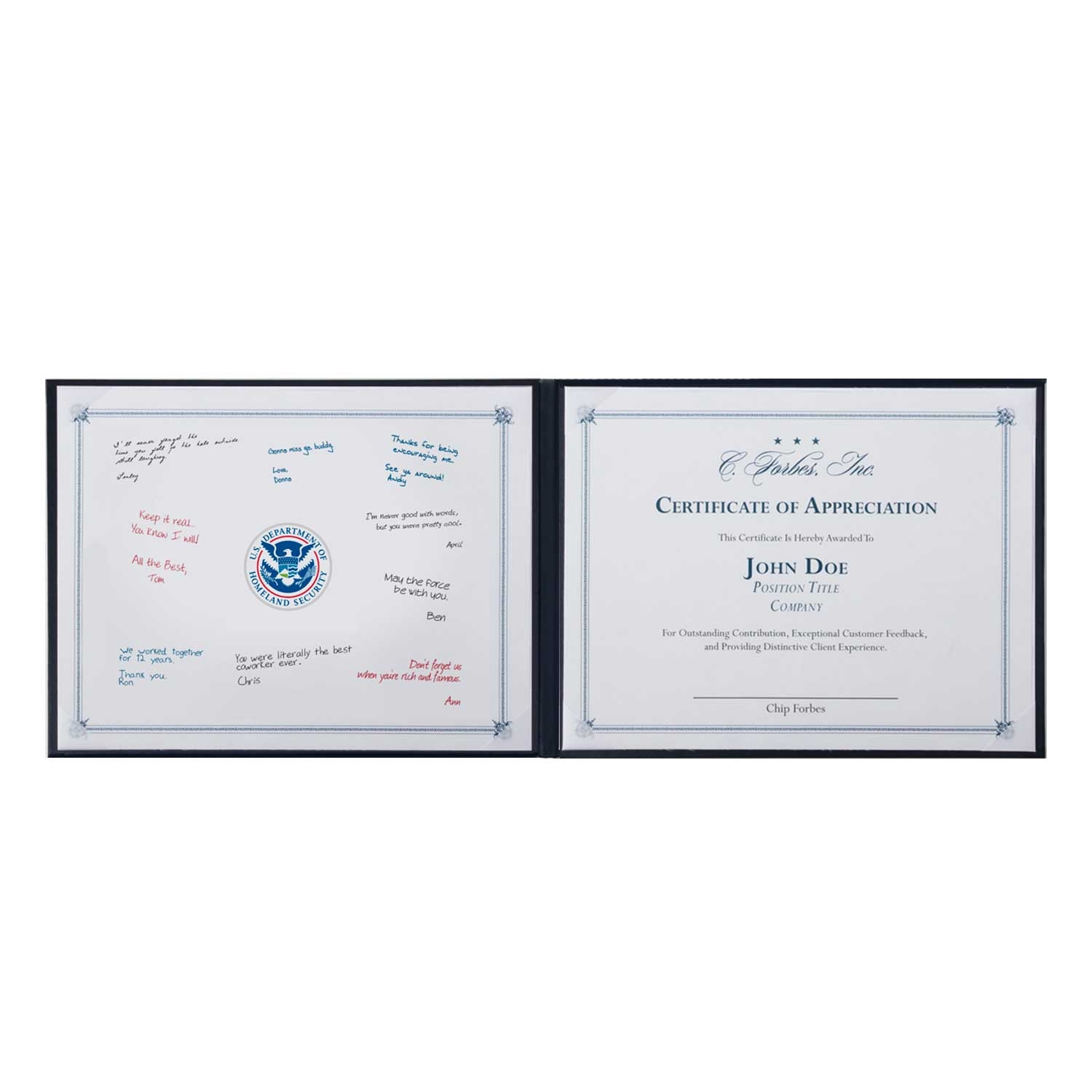 • Inside, it is designed to hold up to two 8.5″ x 11″ certificates or letters