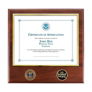 A timeless certificate holding plaque appropriate for any recognition or occasion. The included official CBP Insignia Coin is prominent to the left, with the Border Patrol coin to the right. The certificate window is centered above the coins.