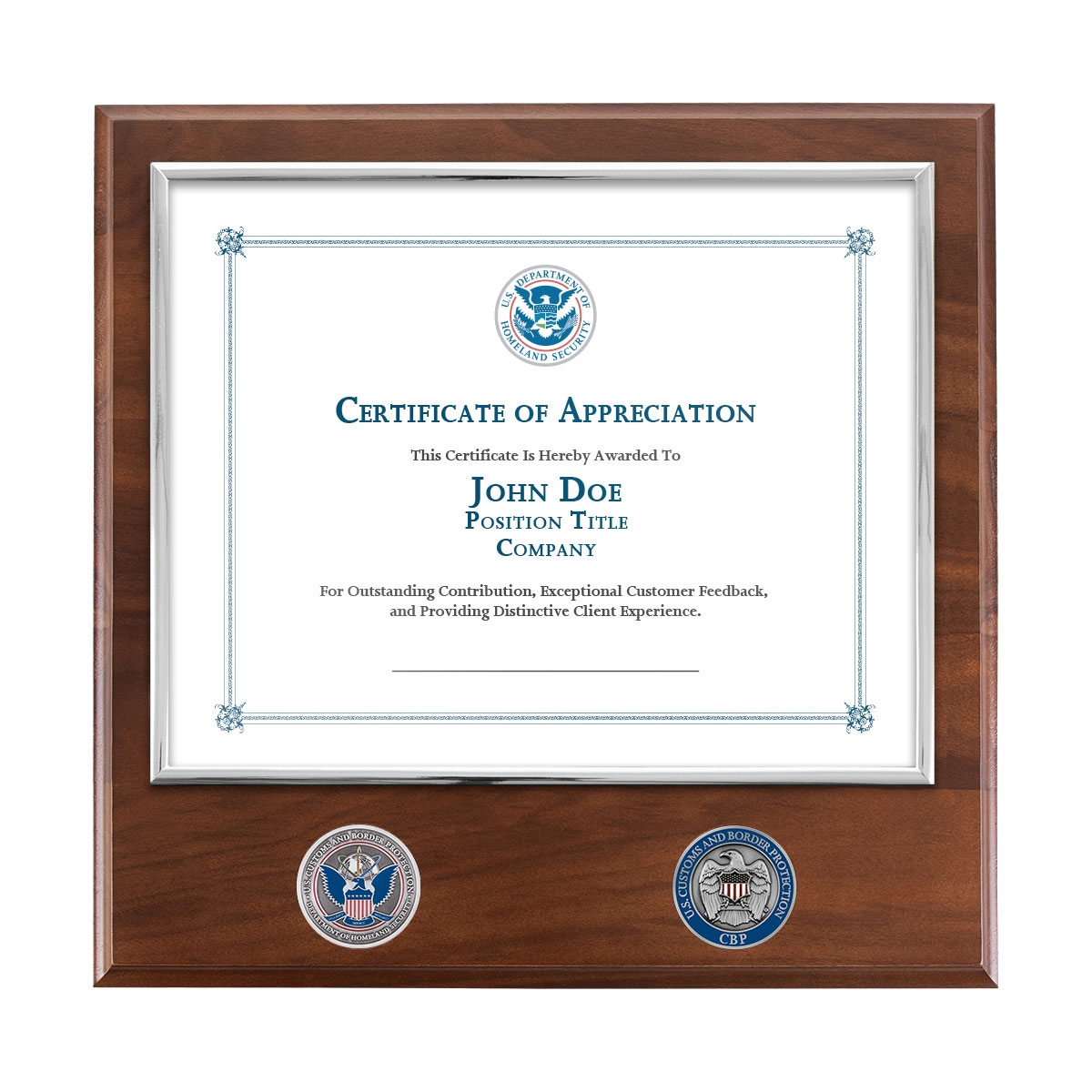 A timeless certificate holding plaque appropriate for any recognition or occasion. The included official DHS Seal Coin is prominent to the left, with the CBP Insignia coin to the right. The certificate window is centered above the coins.