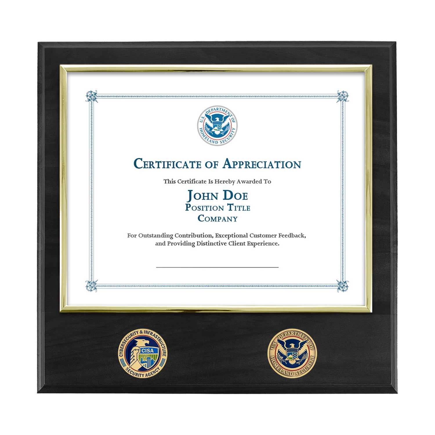A timeless certificate holding plaque appropriate for any recognition or occasion. The included official DHS Seal Coin is prominent to the left, with CISA Logo coin to the right. The certificate window is centered above the coins.