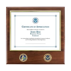 A timeless certificate holding plaque appropriate for any recognition or occasion. The included official CISA Logo Coin is prominent to the left, with DHS Seal coin to the right. The certificate window is centered above the coins.