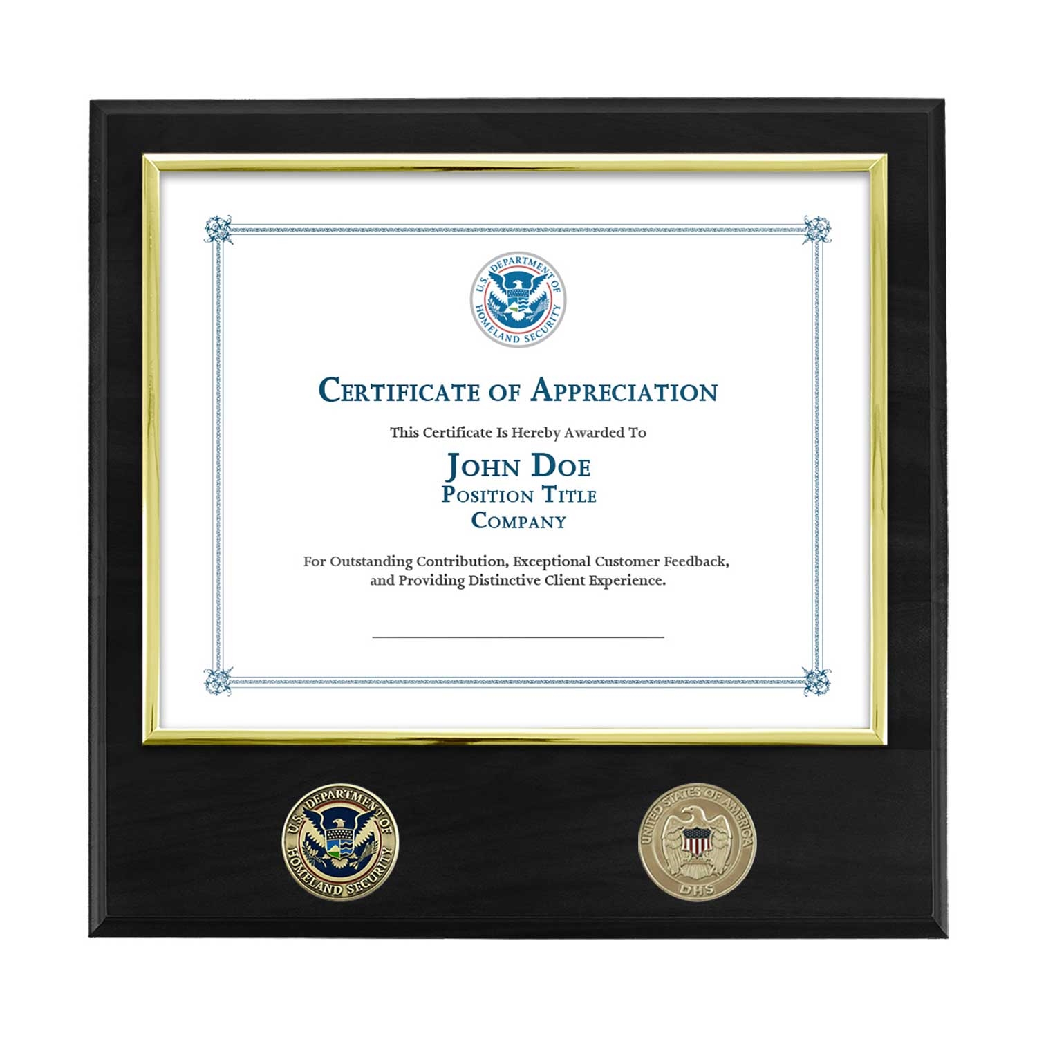 A timeless certificate holding plaque appropriate for any recognition or occasion. The included official DHS Seal Coin is prominent to the left, with our Eagle & Shield DHS coin to the right. The certificate window is centered above the coins.