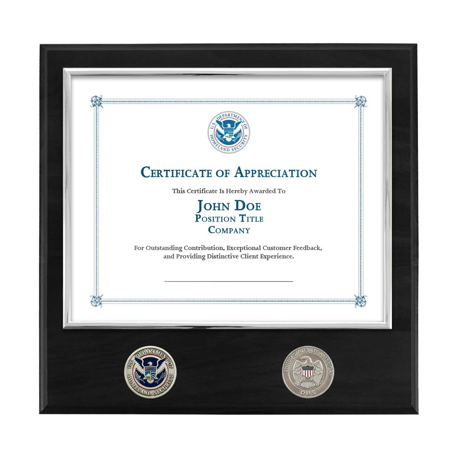 A timeless certificate holding plaque appropriate for any recognition or occasion. The included official DHS Seal Coin is prominent to the left, with our Eagle & Shield DHS coin to the right. The certificate window is centered above the coins.