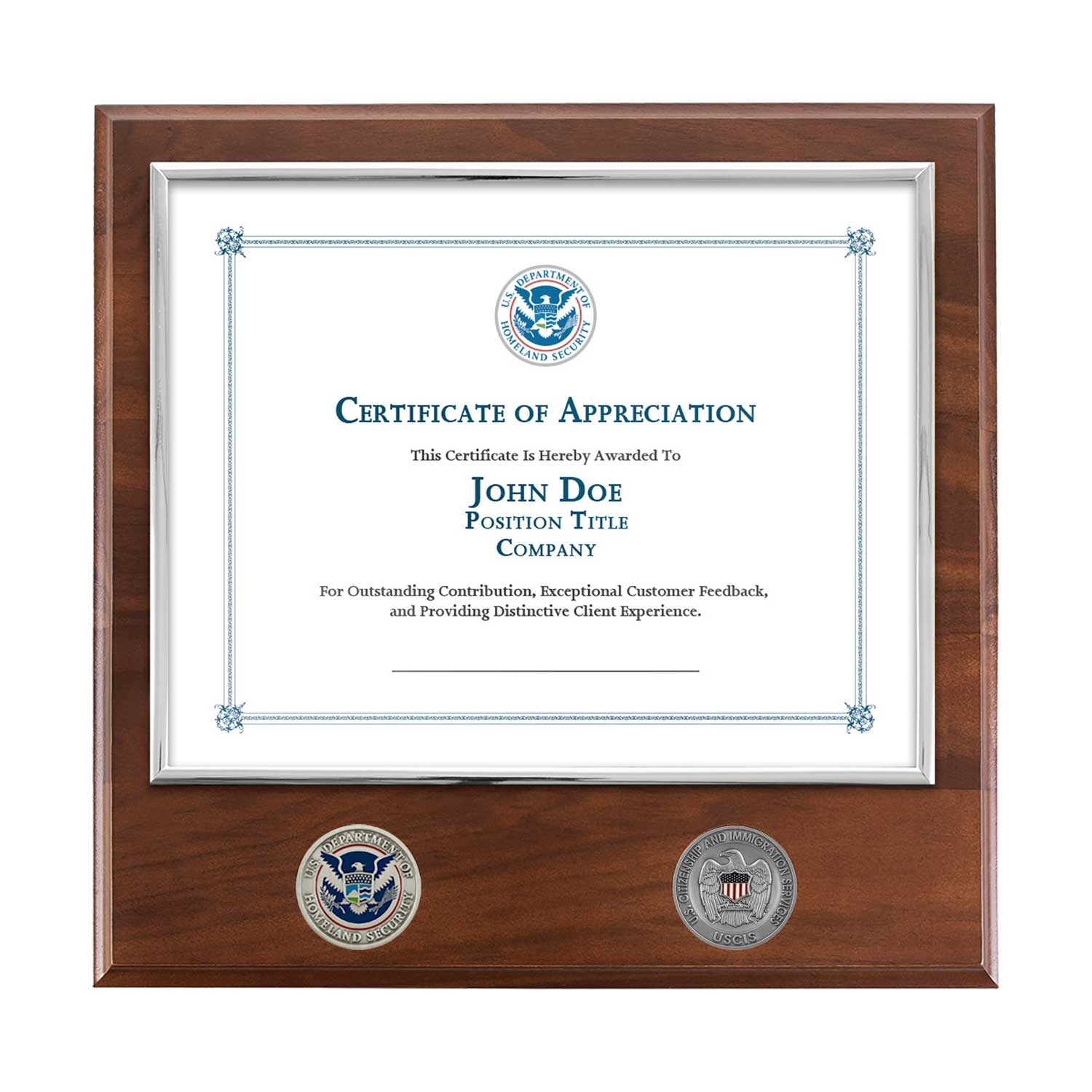 A timeless certificate holding plaque appropriate for any recognition or occasion. The included official DHS Seal Coin is prominent to the left, with our Eagle & Shield USCIS coin to the right. The certificate window is centered above the coins.
