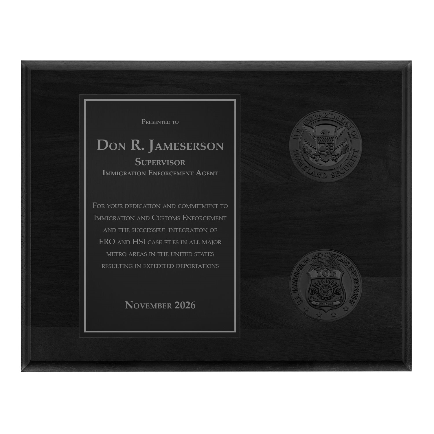 A modern plaque appropriate for any recognition or occasion. The official DHS Seal Coin is prominent. Below it, an ICE Badge est. 2003 Coin. The custom designed inscription plate is aligned left.