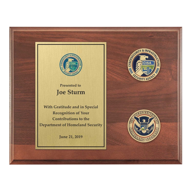 A timeless plaque appropriate for any recognition or occasion. The official DHS Seal Coin is prominent. Below it, an Eagle & Shield CISA Coin. The custom designed inscription plate is aligned left.