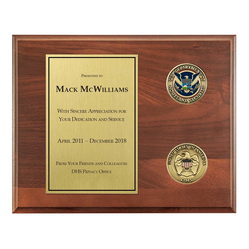 A timeless plaque appropriate for any recognition or occasion. The official DHS Seal Coin is prominent. Below it, an Eagle & Shield DHS Coin. The custom designed inscription plate is aligned left.