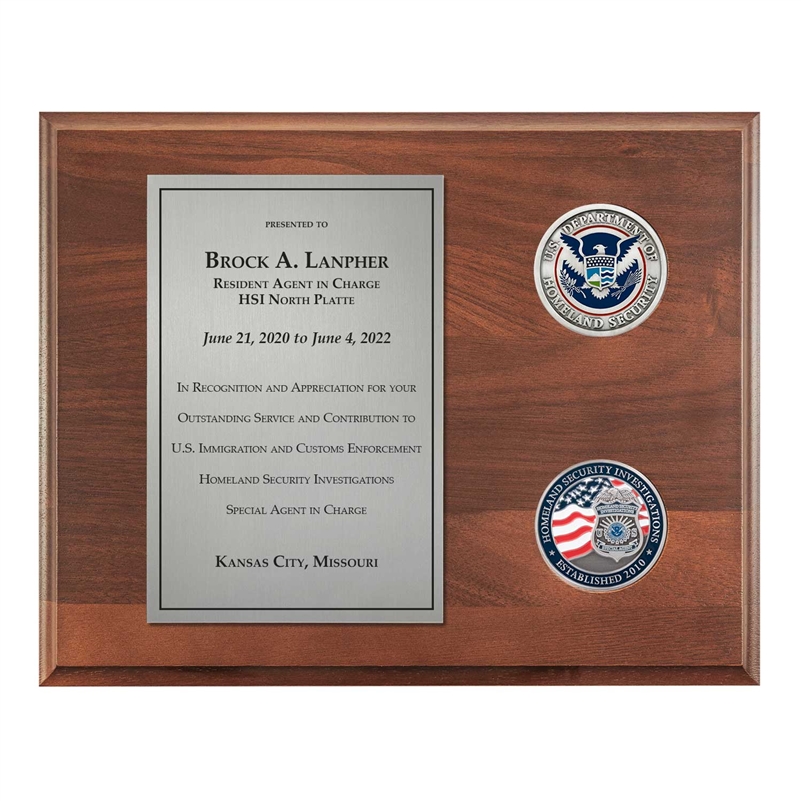 A timeless plaque appropriate for any recognition or occasion. The official CBP Insignia Coin is prominent. Below it, our CBP Shield Design. The custom designed inscription plate is aligned left.