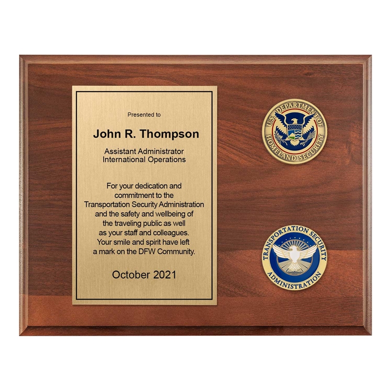 A timeless plaque appropriate for any recognition or occasion. The official DHS Seal Coin is prominent. Below it, new (2020) TSA insignia. The custom designed inscription plate is aligned left.