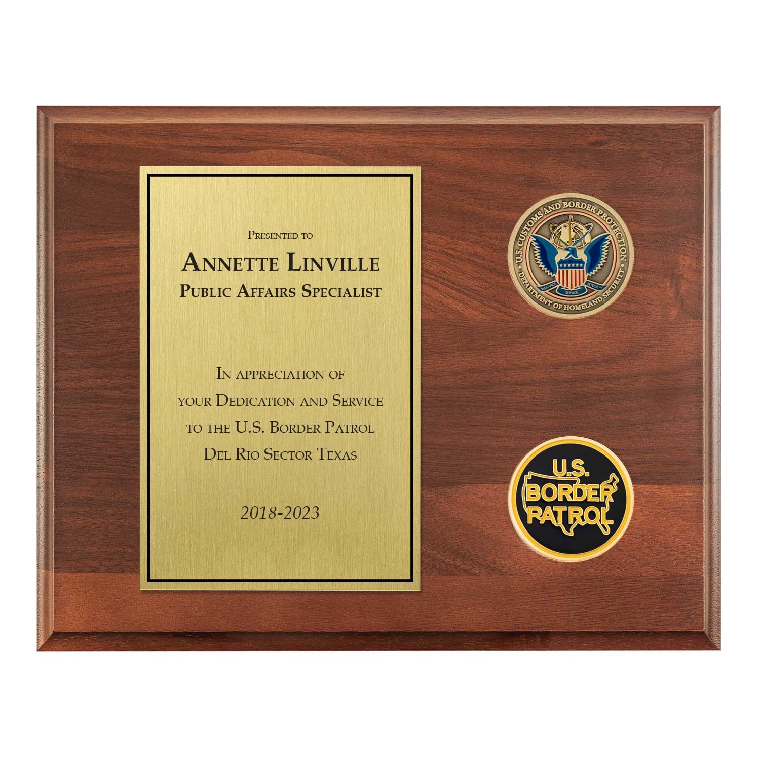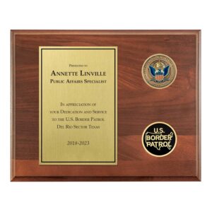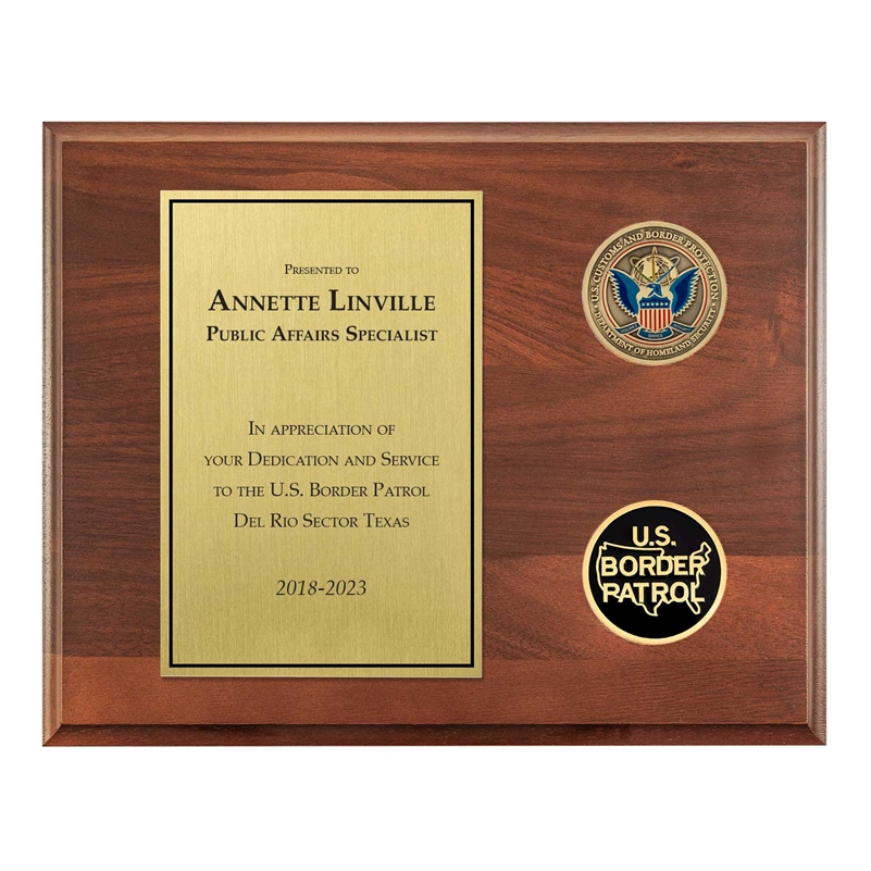 A timeless plaque appropriate for any recognition or occasion. The official CBP Coin is prominent. Below it is the CBP Insignia Design. The custom-designed inscription plate is aligned left.