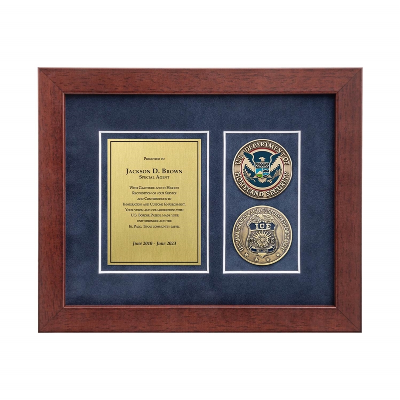 A C. Forbes, Inc. exclusive, this award style is inspired by our ever-popular 2-coins plaque designs in a shadowbox format for desk or shelf display.