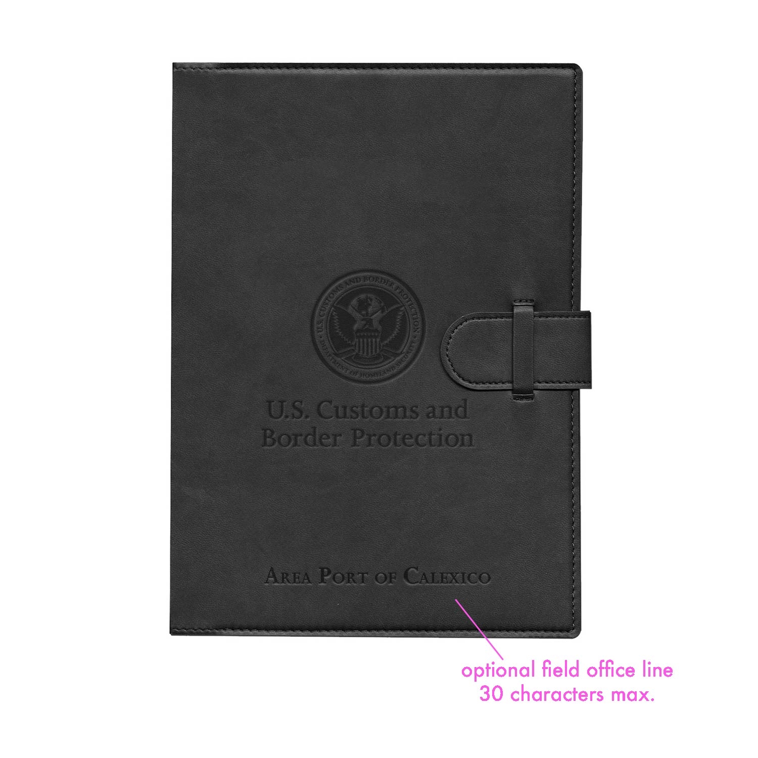 • Optional: Add custom office/unit line at the bottom cover for +1.75/ea. (place inscription in order notes at checkout! around 30 characters is best.) ex. “Area Port of Calexico”