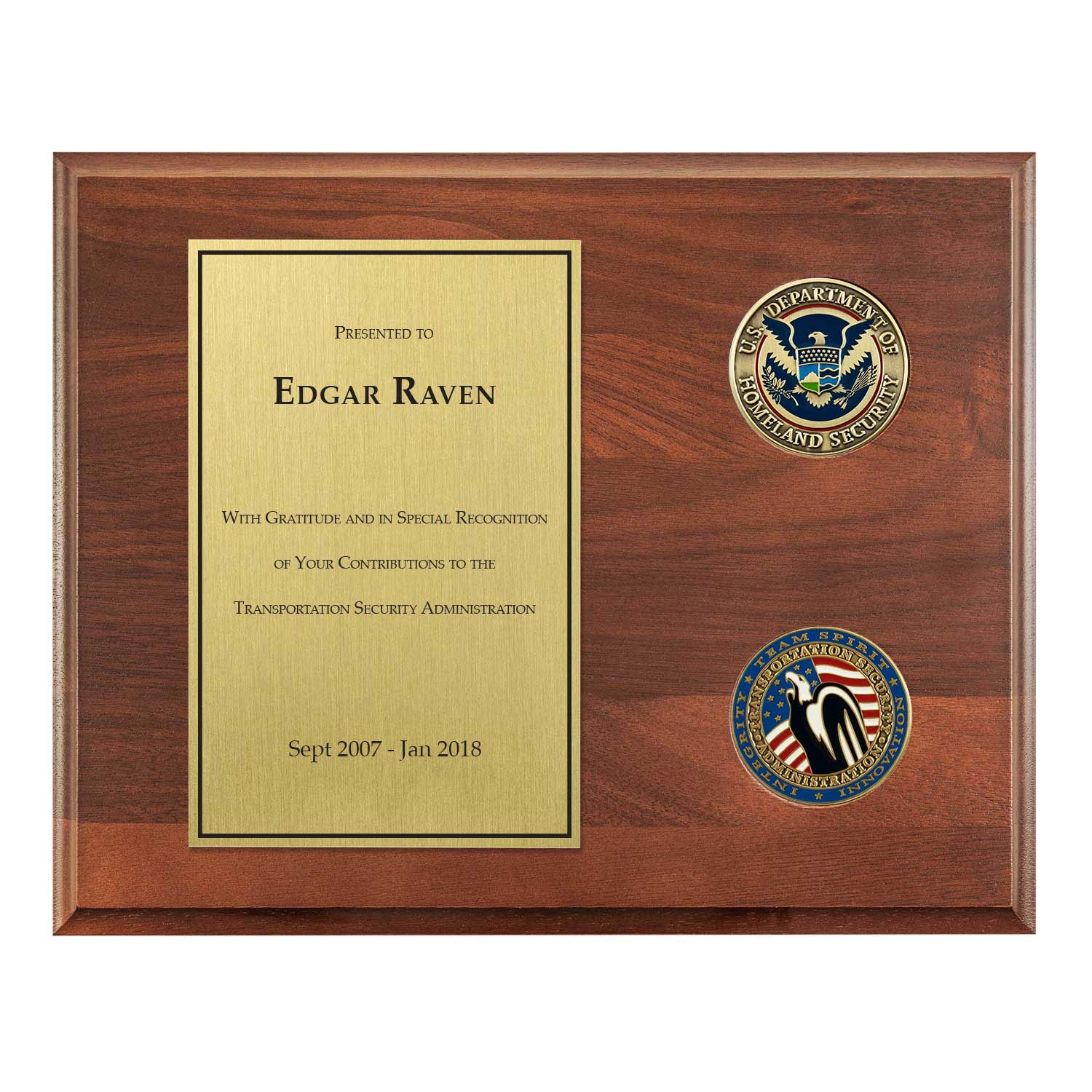 A timeless plaque appropriate for recognition of retirement, legacy, or other special senior leadership accommodation. The official DHS Seal Coin is prominent. Below it, our TSA Legacy Shield Coin. The custom designed inscription plate is aligned left.