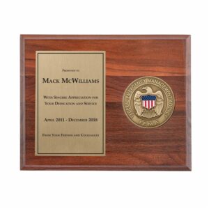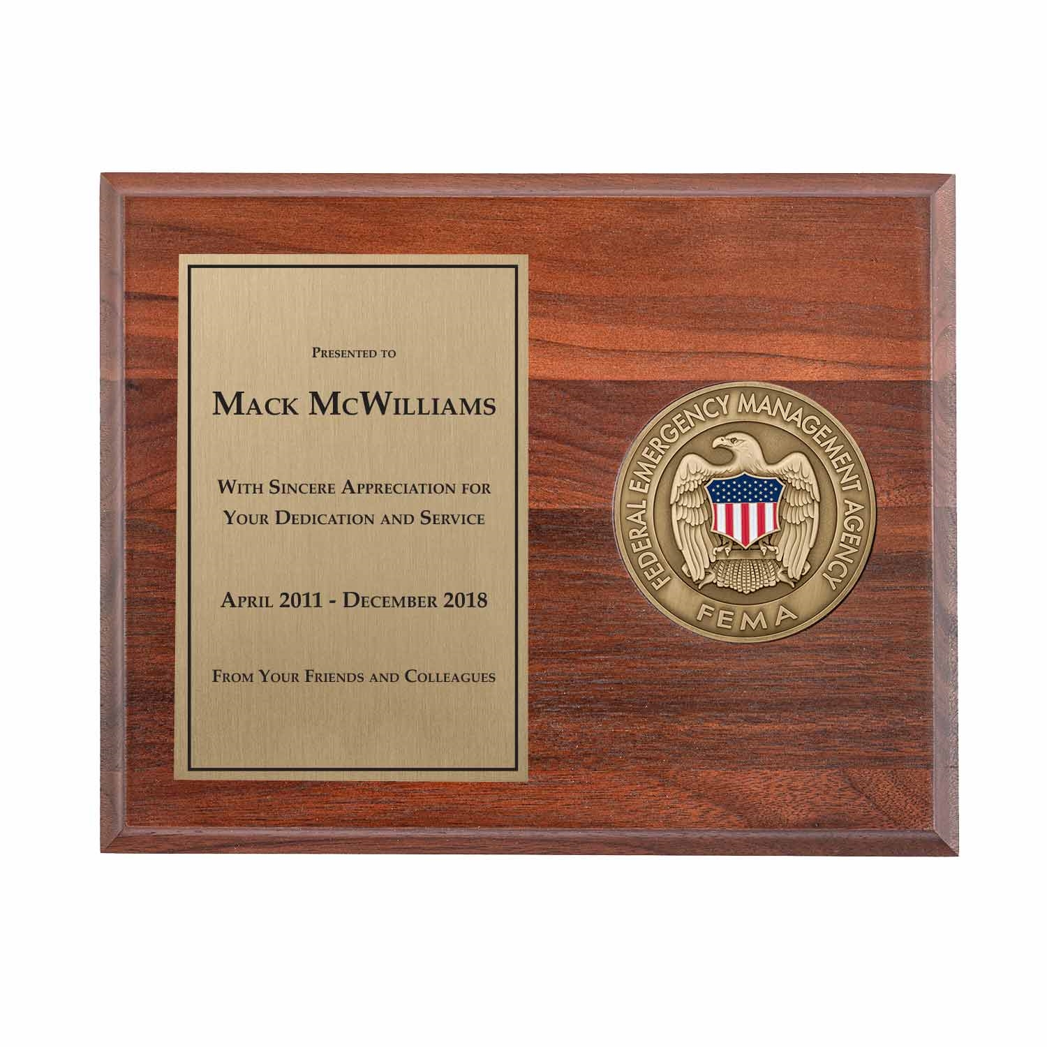 A timeless plaque appropriate for any recognition or occasion. An official FEMA Eagle and Shield 3″ Medallion is prominent to the right. The custom designed inscription plate is aligned left.