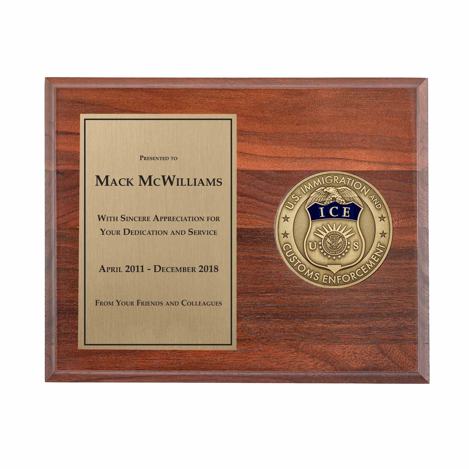 A timeless plaque appropriate for any recognition or occasion. An official ICE Badge 3″ Medallion is prominent to the right. The custom designed inscription plate is aligned left.