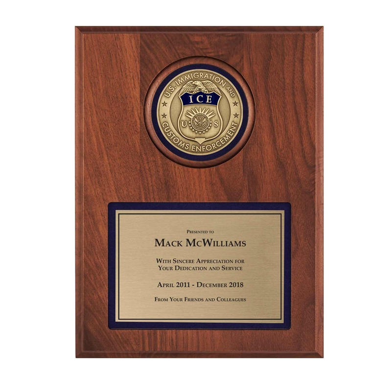 A timeless plaque appropriate for any recognition or occasion. The official ICE Insignia medal is prominent, with the custom-designed inscription plate below.