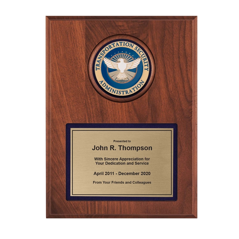 A timeless plaque appropriate for any recognition or occasion. The official TSA medal is prominent, with the custom-designed inscription plate below.