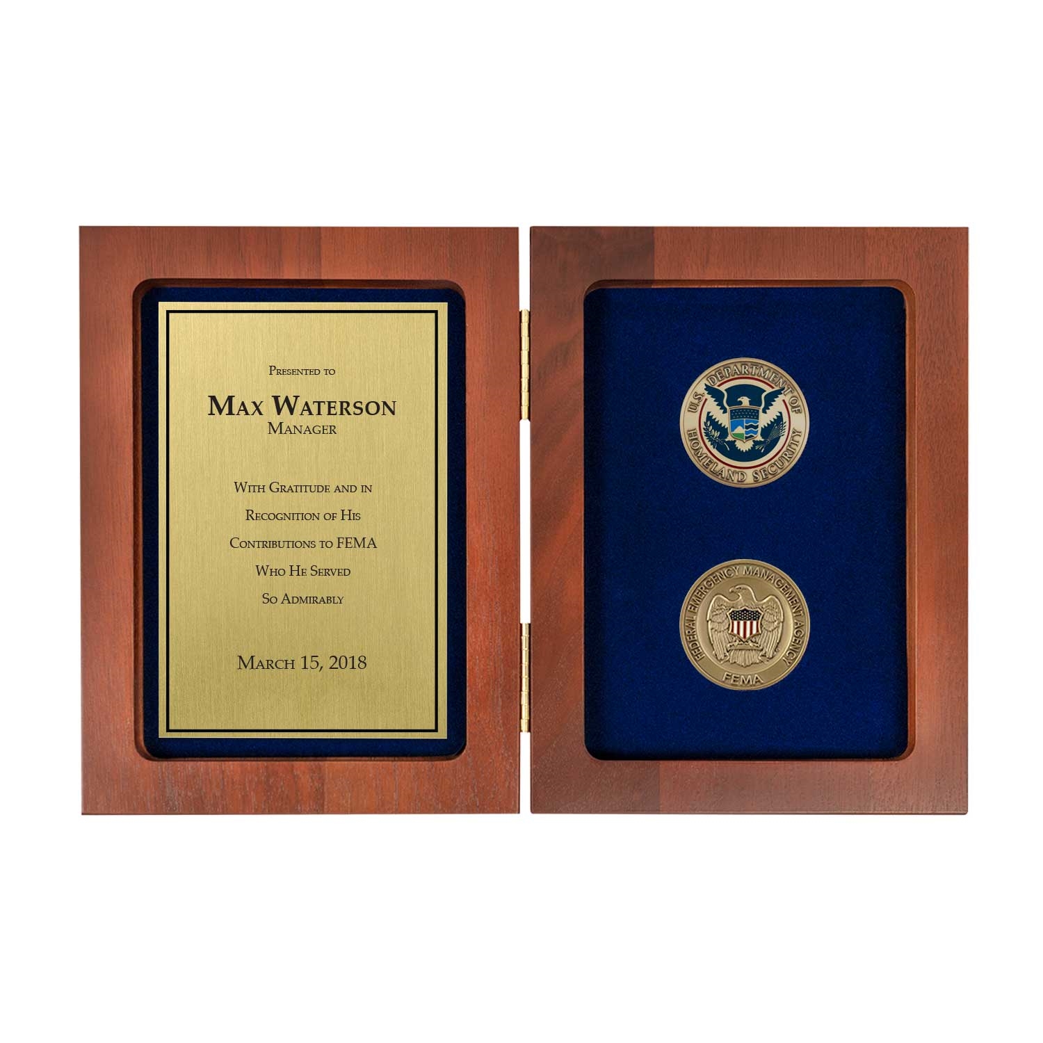 - Includes: Two 1-3/4″ antiqued brass, die-struck challenge coins (Top: DHS seal / Bottom: Eagle, FEMA), recessed on right side