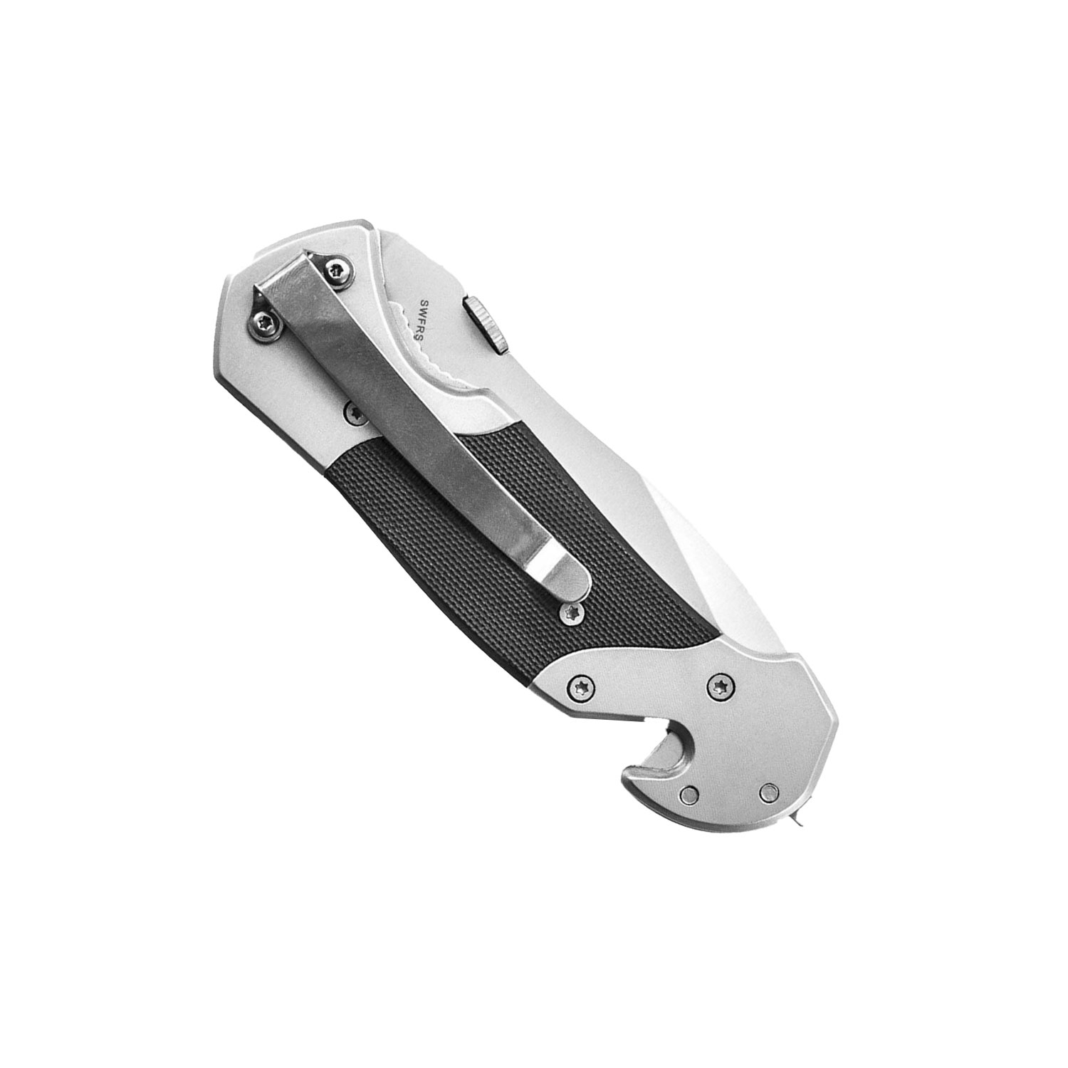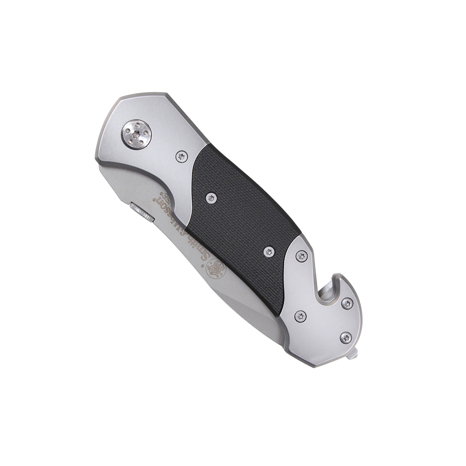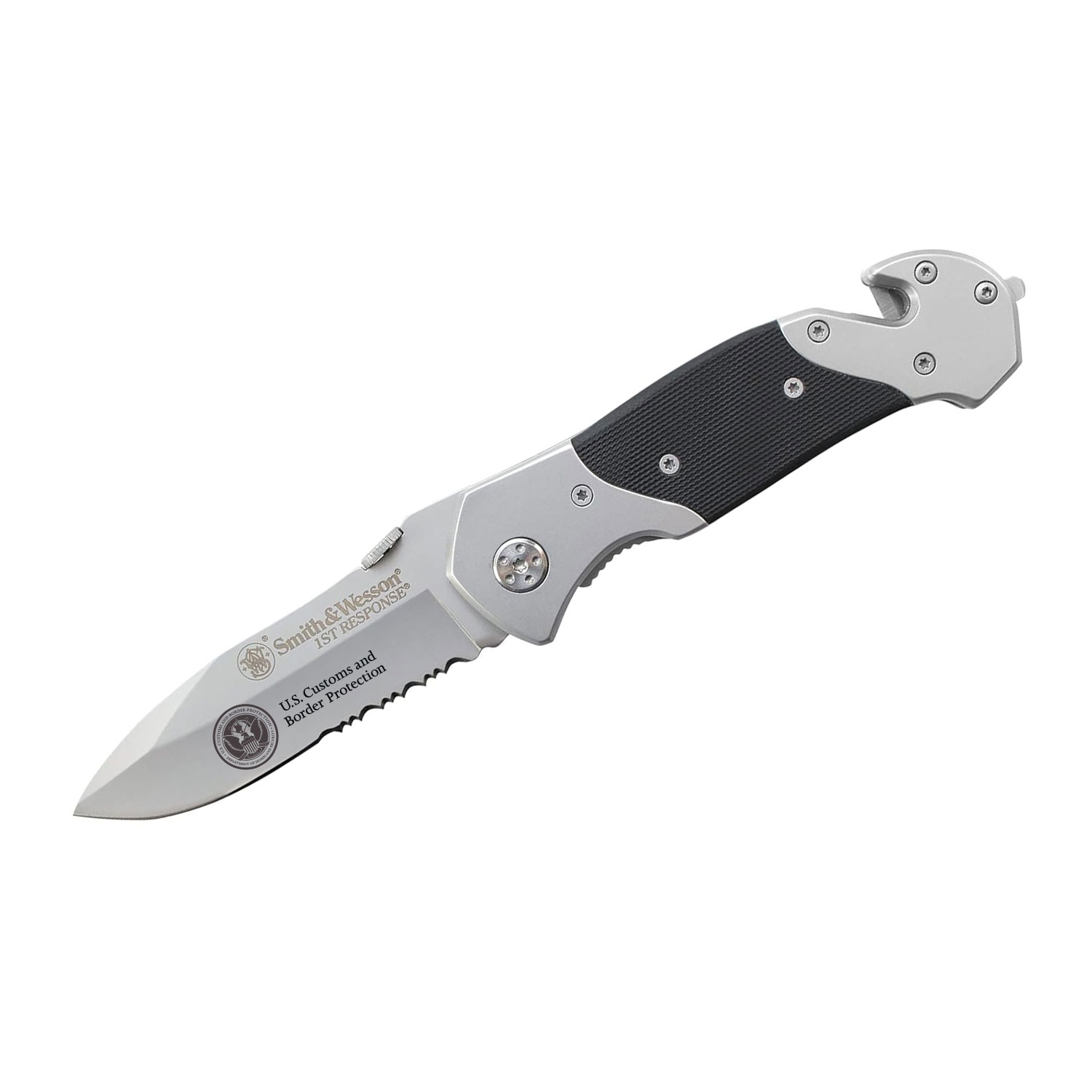 Perfect for EDC, this Smith & Wesson 1st Response Liner Lock Folding Knife is made out of high carbon stainless steel partially serrated drop point blade with ambidextrous thumb disc. Its stainless-steel handle with black G-10 inlay, glass breaking tool, a strap cutter, and pocket clip.