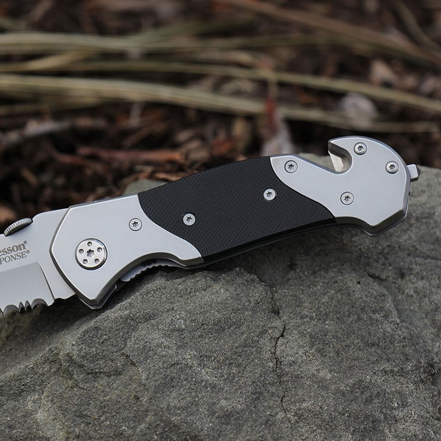 Perfect for EDC, this Smith & Wesson 1st Response Liner Lock Folding Knife is made out of high carbon stainless steel partially serrated drop point blade with ambidextrous thumb disc. Its stainless-steel handle with black G-10 inlay, glass breaking tool, a strap cutter, and pocket clip.
