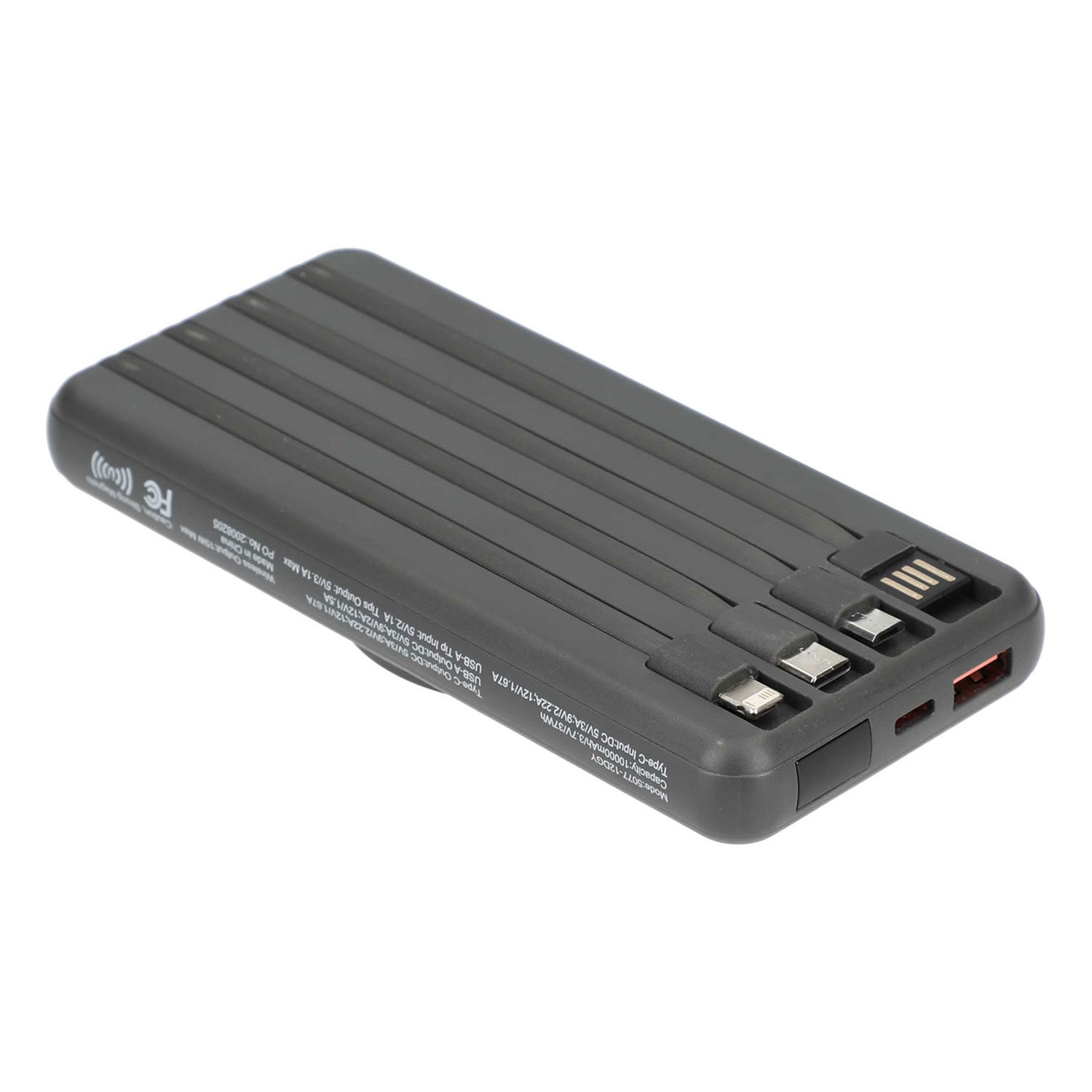 - Integrated cables (Input: USB-A, Output: Micro USB, USB-C, Lighting)