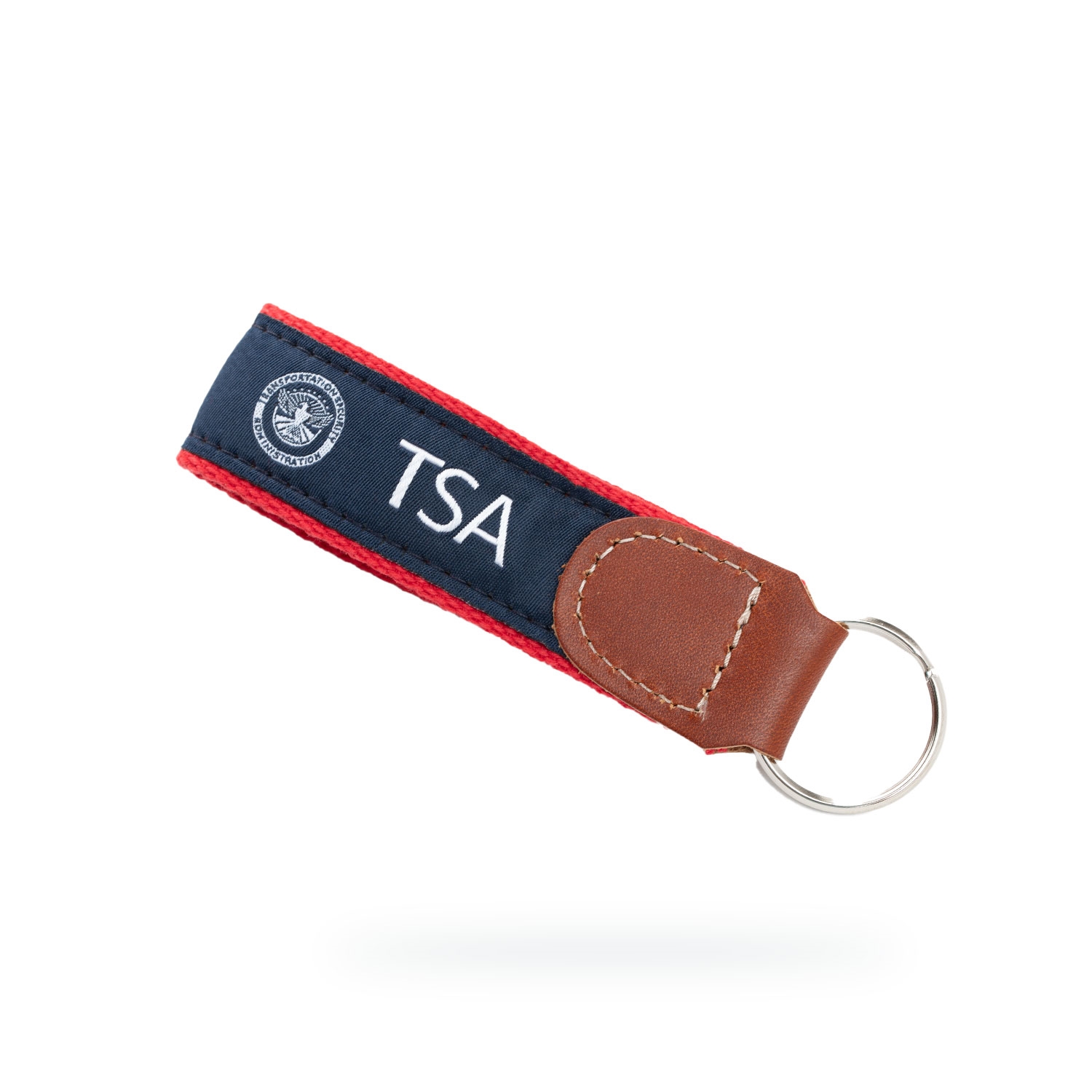 Carry your keys with pride and purpose. This premium key fob is hand-stitched with the official TSA insignia and acronym in a navy, woven ribbon, framed by rich red cotton and finished with genuine American leather. The sturdy split ring holds keys securely, while the looped design makes it easy to grab or hang.
