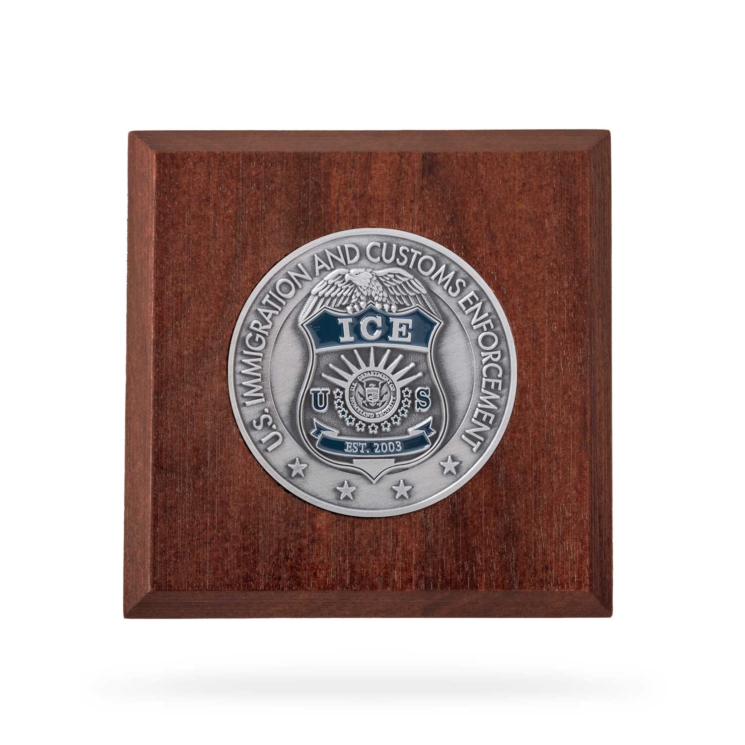 • Features agency challenge coin affixed and inlaid at center