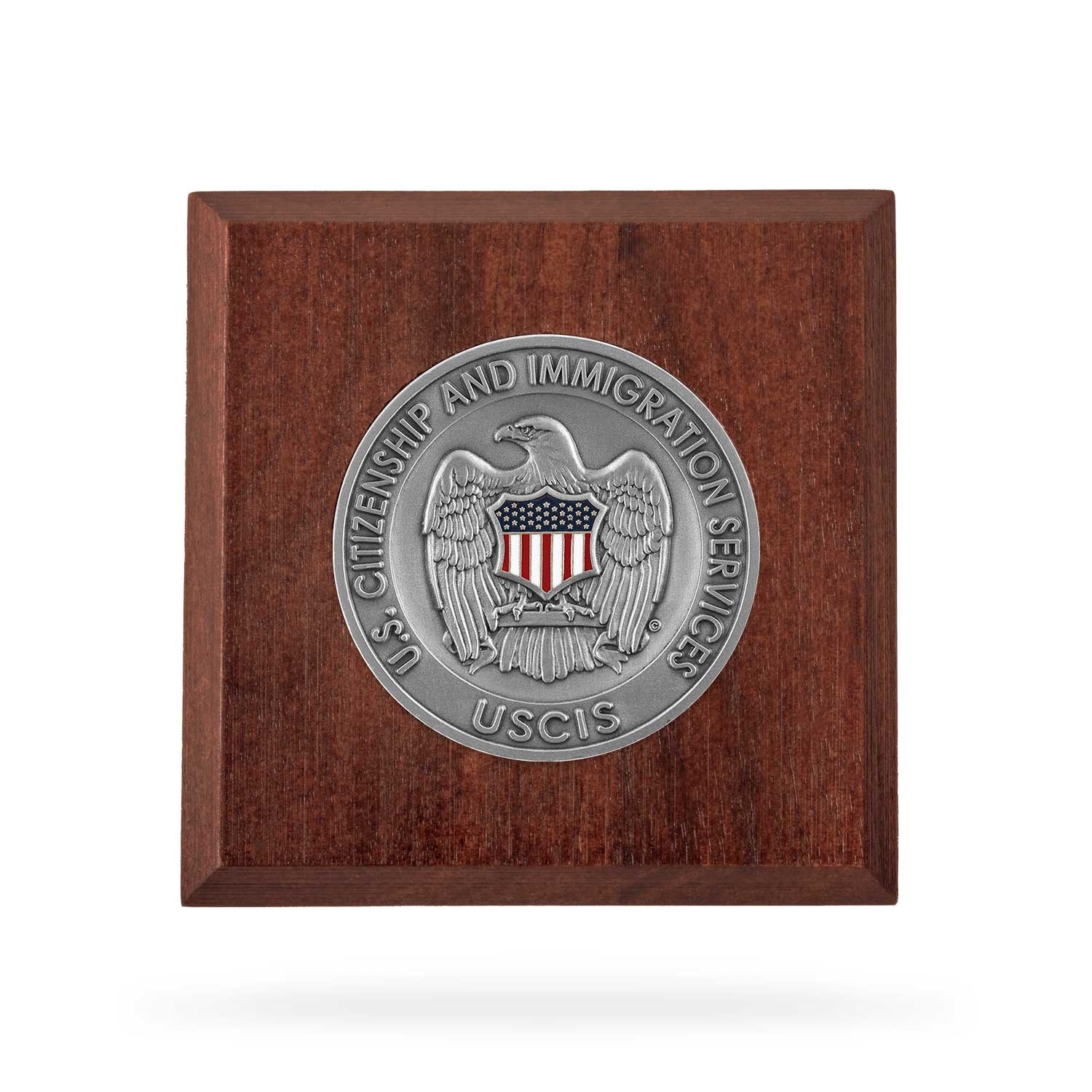 Wooden Paperweight w/ Coin (USCIS) – Silver